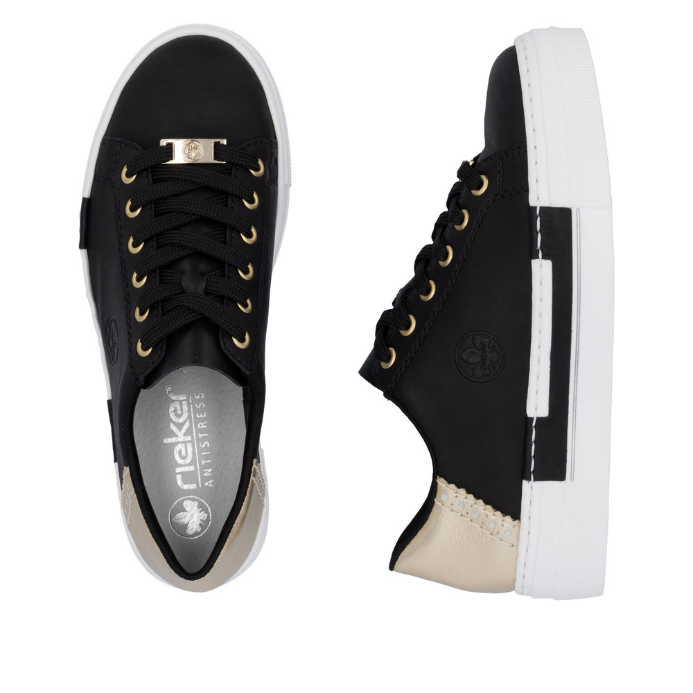 La mode rencontre la fonctionnalité. Vous ne voudrez plus quitter ces baskets basses noires Rieker. Fabriquées selon la technique traditionnelle du cousu, elles offrent robustesse et flexibilité. De plus, le laçage assure un ajustement parfait. La semelle plateforme amortissante et très légère assure une sensation de marche agréable, même après un port prolongé, et la semelle extérieure extra-souple est un atout supplémentaire. Vos meilleures alliées pour la nouvelle saison !