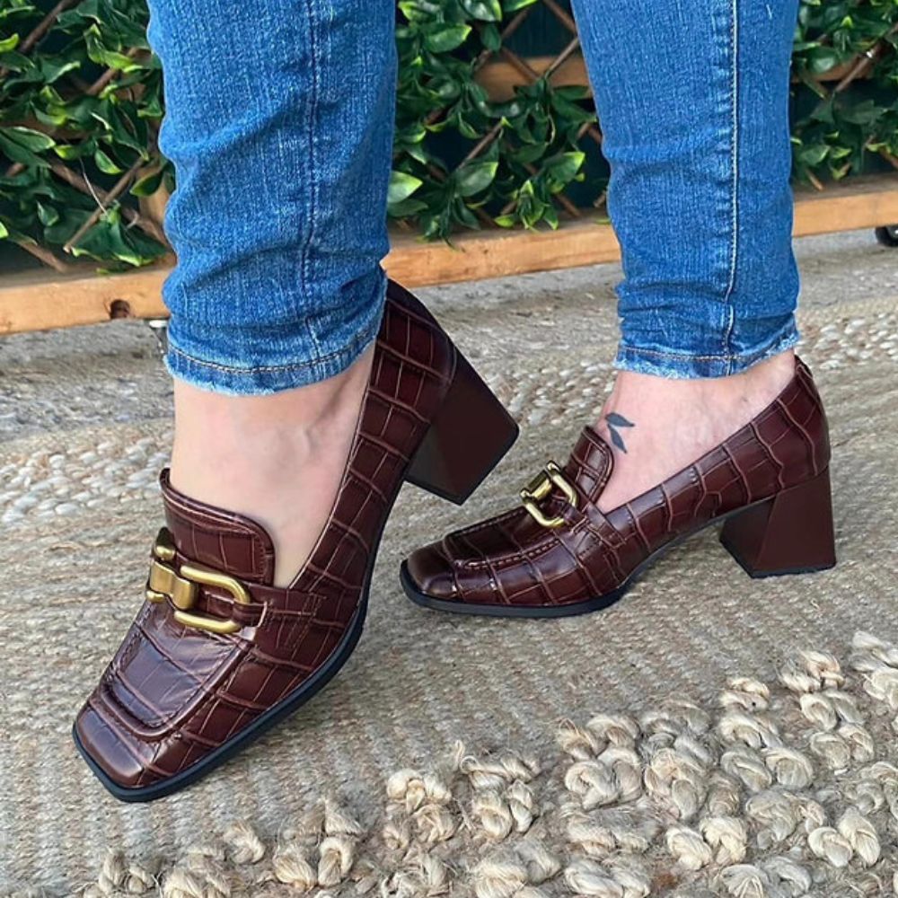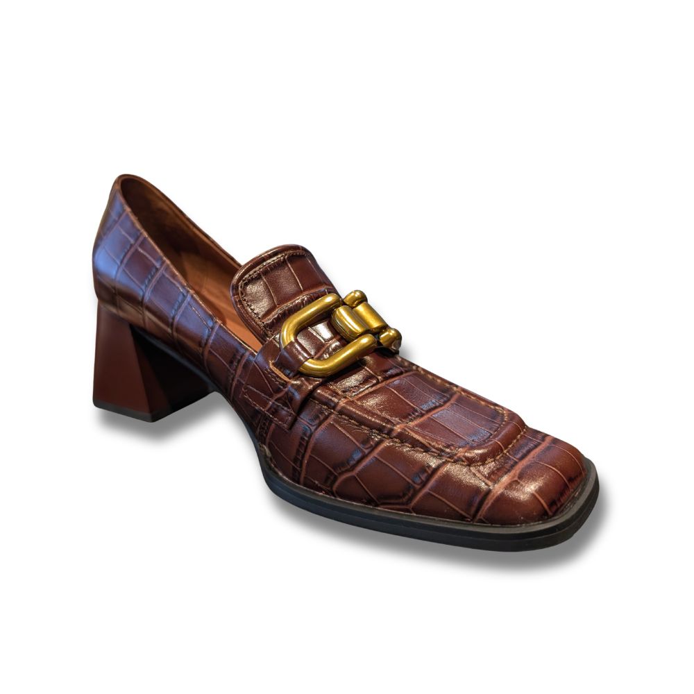 Confectionnées en cuir de qualité, elles se distinguent par leur finition texturée effet crocodile dans une teinte marron profond, apportant du caractère et du raffinement à l’ensemble. Leur silhouette reprend les codes du mocassin traditionnel, avec un bout légèrement carré et une ligne épurée, tout en étant modernisée par un talon bloc de hauteur moyenne qui assure à la fois stabilité et confort au quotidien.