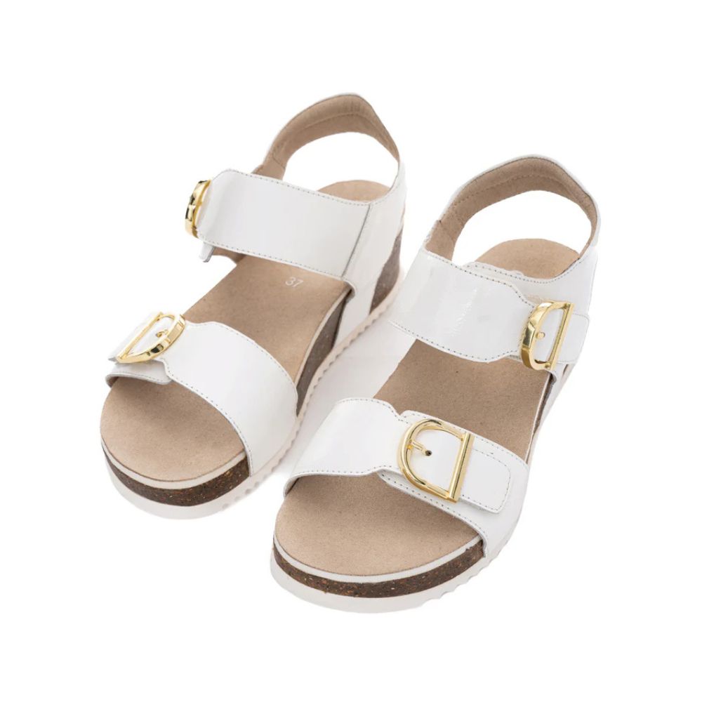Alliant brillance, soutien et légèreté, la sandale Ara Nova en cuir verni blanc est parfaite pour les femmes qui souhaitent combiner style et confort sans compromis. Sa silhouette élégante repose sur une semelle compensée en liège, qui assure à la fois stabilité et allure moderne.