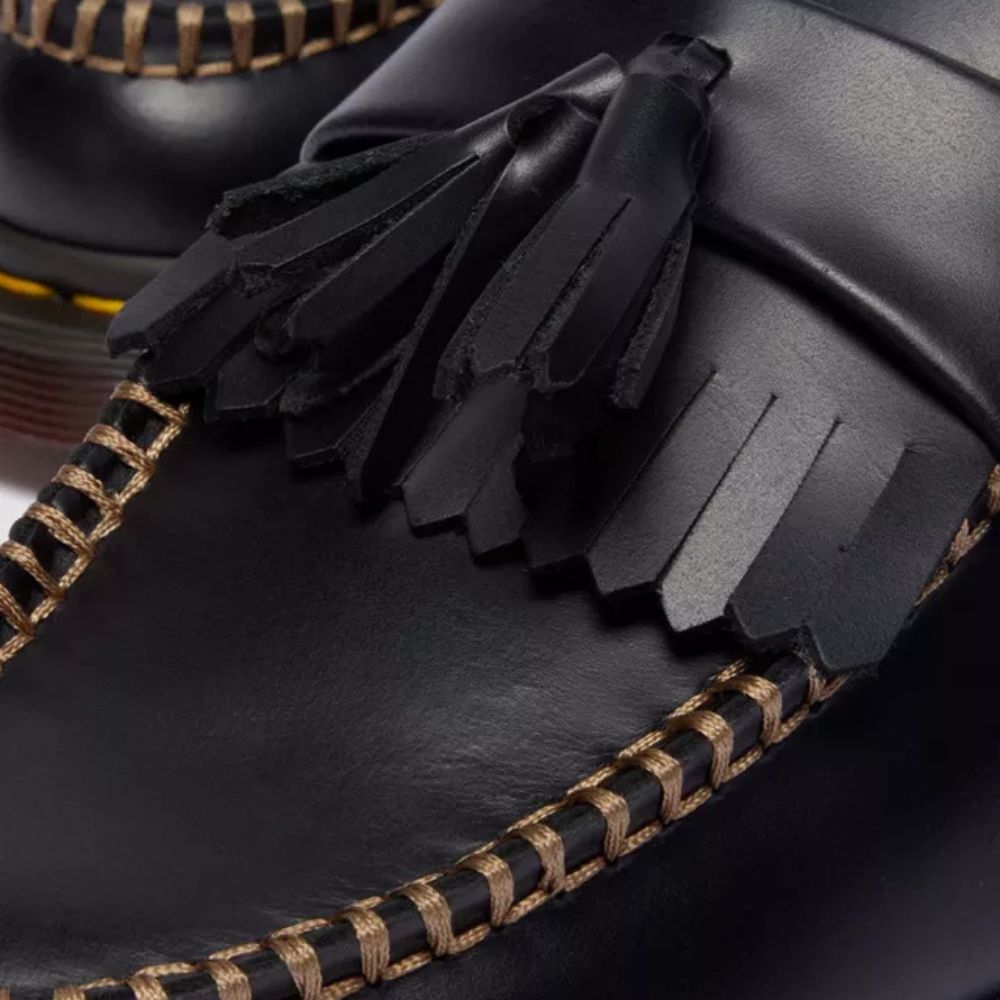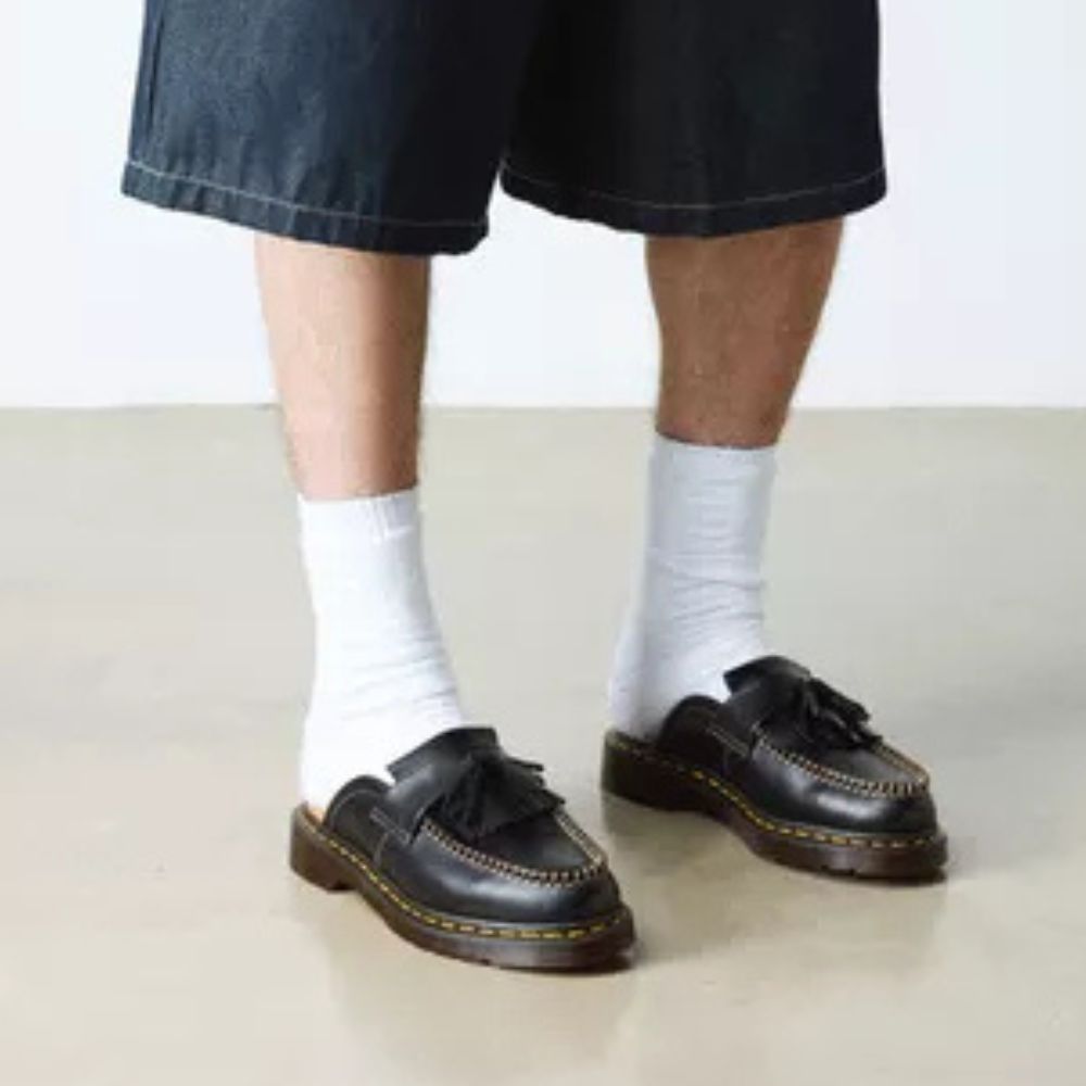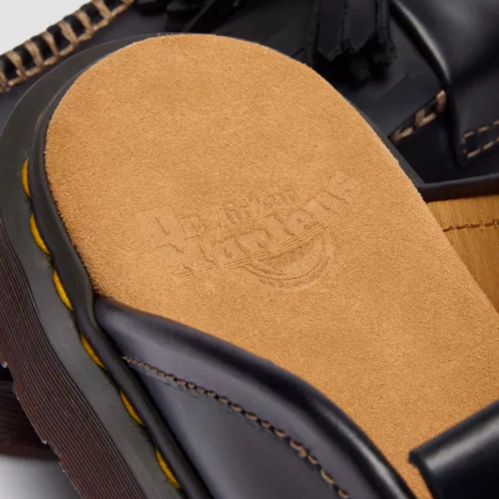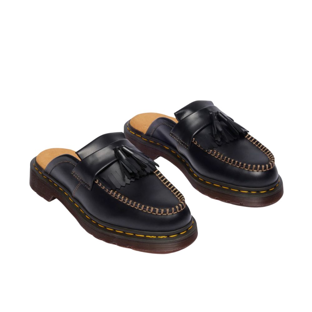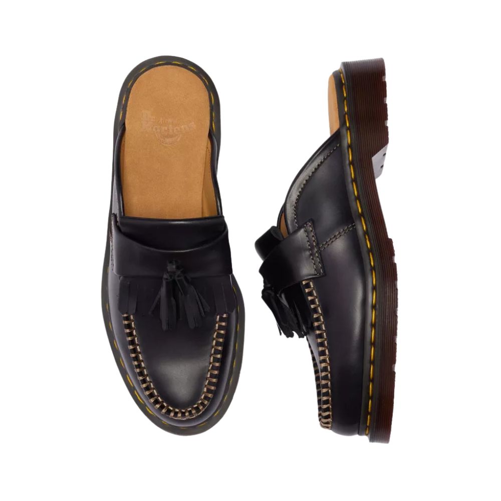L'Adrian fait tourner les têtes depuis des décennies. Aujourd'hui, elle se réinvente en une mule décontractée, résolument moderne. Confectionnée en cuir souple Orleans, cette mule conserve tout le caractère du mocassin original, avec son double pompon classique, ses franges façon kiltie et ses finitions cousues main pour un style authentique. Montée sur une semelle intérieure rétro et ornée des surpiqûres jaunes emblématiques de Dr. Martens, elle ouvre un nouveau chapitre dans l'histoire de l'Adrian.