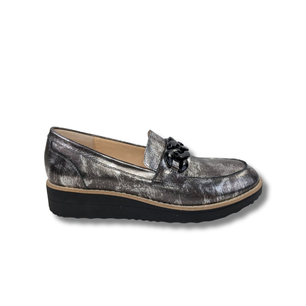 Mocassin Ozamas de la marque Django & Juliette, réalisé en cuir argenté et noir pour un contraste raffiné et moderne. Sa boucle décorative en métal apporte une touche sophistiquée et souligne l’élégance du modèle. Chic et intemporel, ce mocassin est idéal pour compléter une tenue habillée comme un look plus urbain avec style.