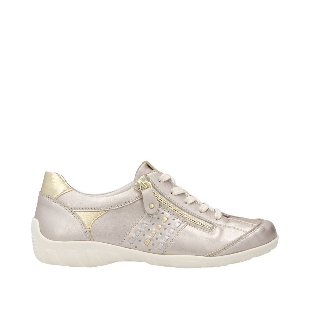 Élégantes sur la route ! Ces chaussures à lacets métallisées Remonte en cuir lisse sont un véritable accroche-regard ! L'association astucieuse du laçage et de la fermeture éclair offre un maintien optimal et facilite l'enfilage et le retrait. La semelle intérieure rembourrée et amovible ainsi que la semelle adhérente et amortissante sont des atouts supplémentaires. Ce modèle est également disponible jusqu'à la pointure 45 et est coupé en largeur confort. Grâce à sa doublure légère en microvelours, le confort est garanti. Fidèle à la devise : le confort rencontre le style !
