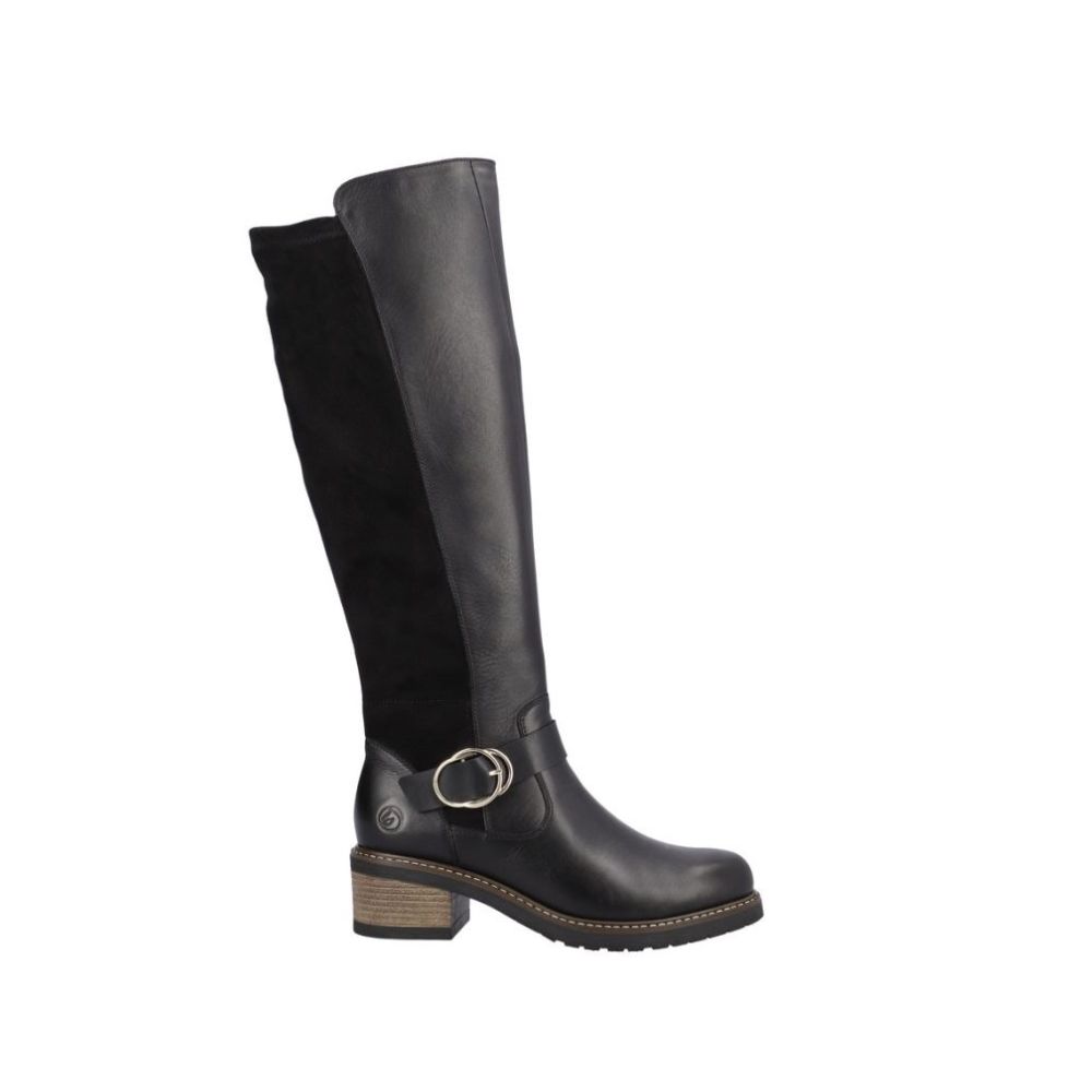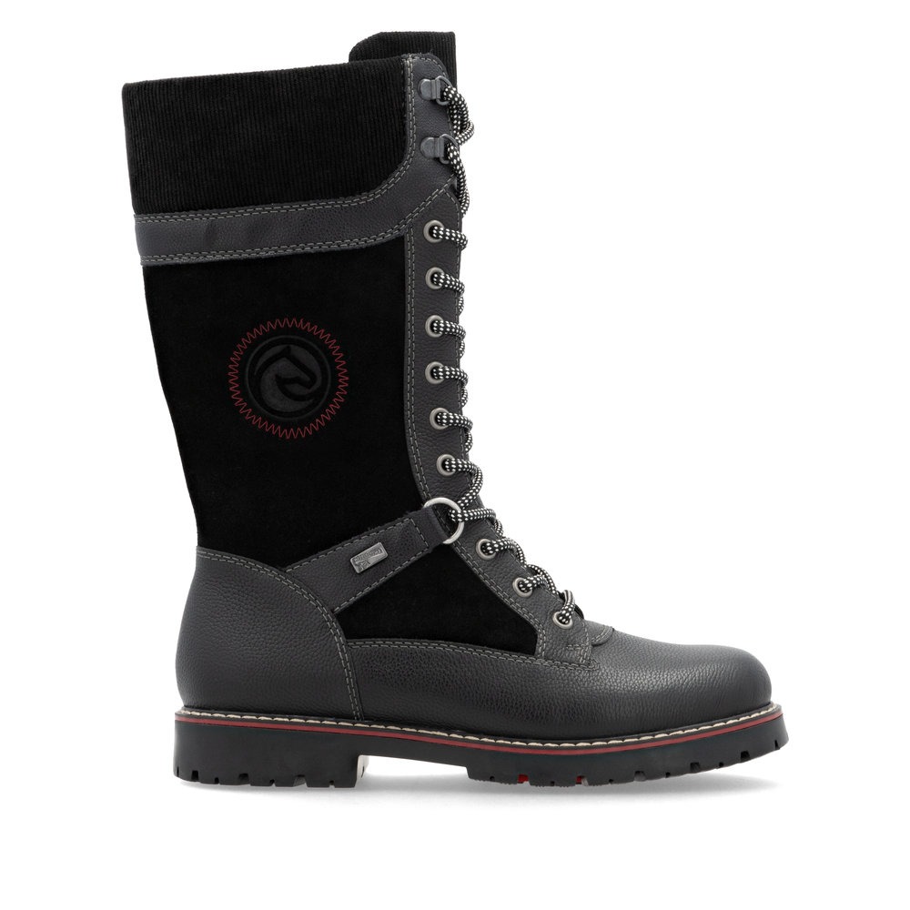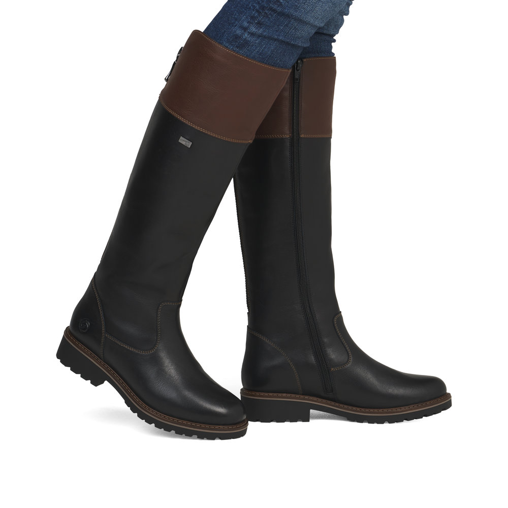 Style ET confort : il n'y a pas de « ou » ! Ces confortables bottes hautes Remonte noires et marron en cuir lisse impressionnent par leur look tendance et leur fonctionnalité. Une fermeture éclair permet un enfilage rapide et facile. Le col de tige contrasté apporte une finition parfaite et un look original. La semelle amortissante et adhérente, associée à la semelle intérieure amovible, procure une sensation de bien-être à chaque pas. De plus, la largeur confort offre à vos pieds une plus grande liberté de mouvement à l'avant-pied. La tige Vario assure un ajustement optimal au mollet. Grâce à la membrane remonteTEX déperlante, un confort optimal est assuré même par temps humide et froid. La doublure intérieure moelleuse en velours et velours garde les pieds au chaud. Difficile de faire plus stylé !