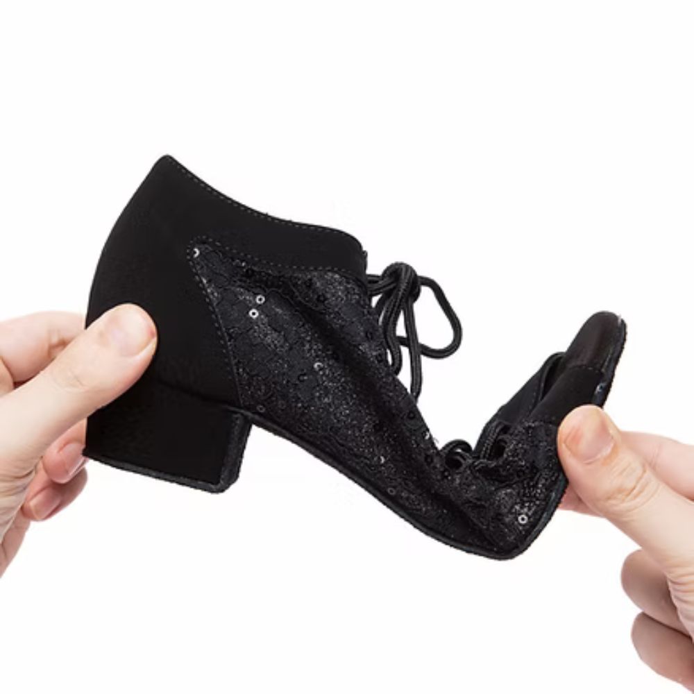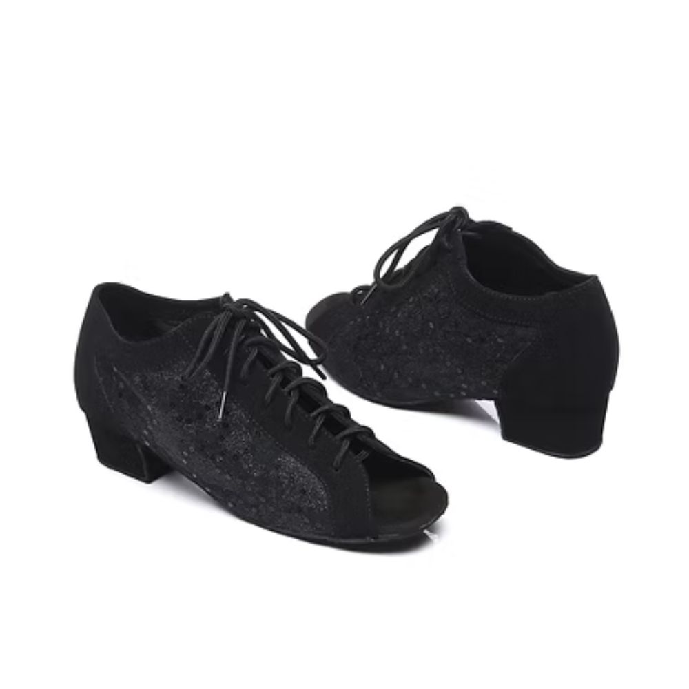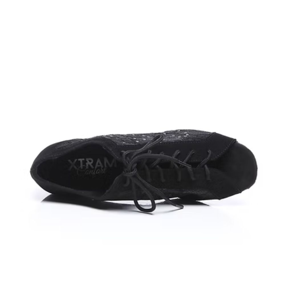 Ces souliers de danse XTRAM séduisent par leur style élégant et raffiné. Confectionnés en tissu noir orné de fleurs brodées et de paillettes, ils apportent une touche lumineuse et féminine. Leur laçage assure un ajustement précis et un bon maintien du pied, tandis que la semelle extérieure en suède offre une glisse contrôlée idéale pour la danse. Leur talon stable garantit confort et équilibre sur la piste.