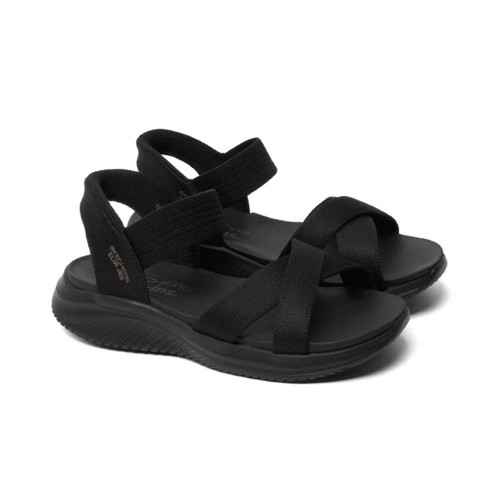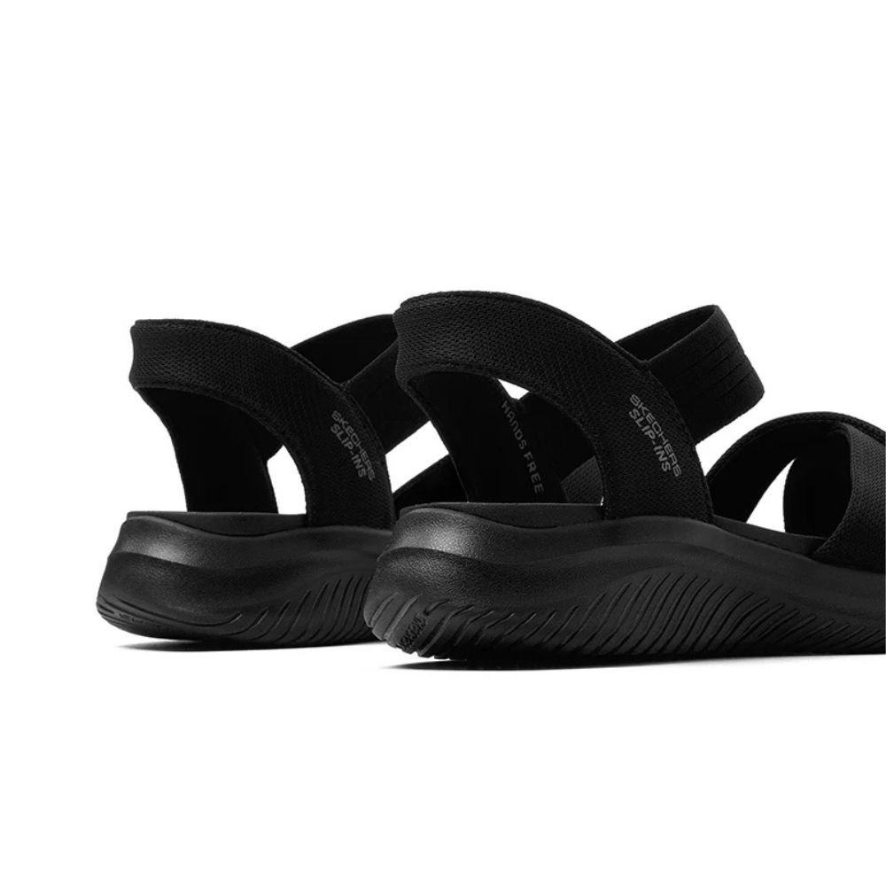 Adoptez un style estival sans effort avec la sandale SLIP-INS ULTRA FLEX 3.0 de Skechers, conçue pour les femmes recherchant confort et praticité à travers le Canada. Cette sandale à bride arrière est dotée d'une tige en tissu extensible respirant et du talon Hands Free Slip-ins® avec la technologie Heel Pillow™, permettant un enfilage facile sans les mains.