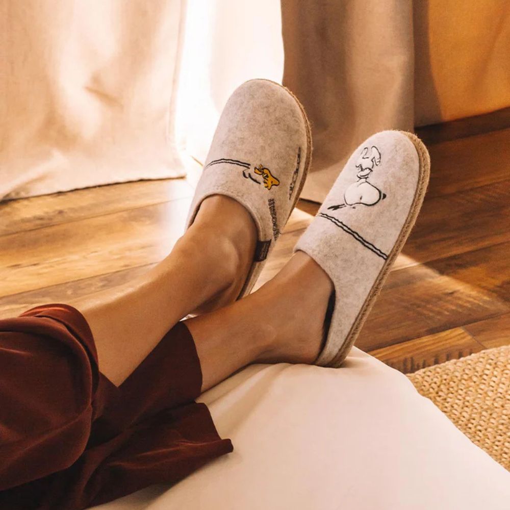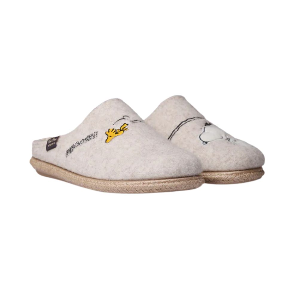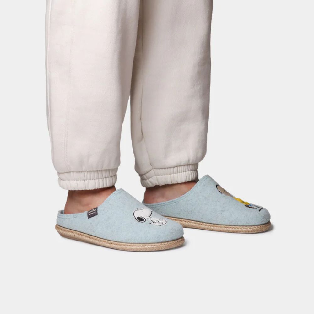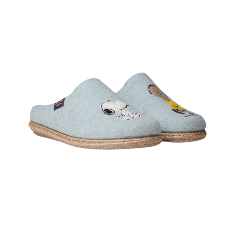 SNOOPY. Ces sabots pour femme font partie de la collection capsule Snoopy. Confectionnés en feutre, ils arborent les personnages emblématiques de Snoopy sur la tige. La semelle plate de 2 cm d'épaisseur associe caoutchouc et tresse de jute pour un style original et décontracté. Ils sont dotés d'une semelle intérieure amovible avec un talon compensé de 2,5 cm, doublée de tissu pour un confort optimal. La semelle extérieure en caoutchouc antidérapant assure une excellente adhérence.