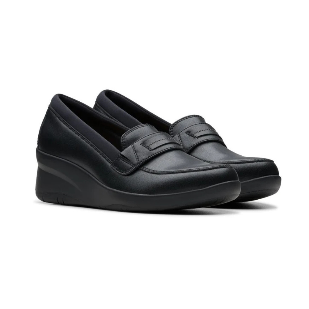 Découvrez l'élégance et le confort réunis avec la chaussure noire à talon compensé Suttyn Penny de CLARKS. Conçue pour la femme moderne à la recherche d'une chaussure facile à enfiler et adaptée à une utilisation quotidienne, ce modèle polyvalent ne sacrifie ni le style ni le confort. Sa tige en cuir noir premium, associée à un col en textile extensible, assure un ajustement parfait tout en offrant un look raffiné.