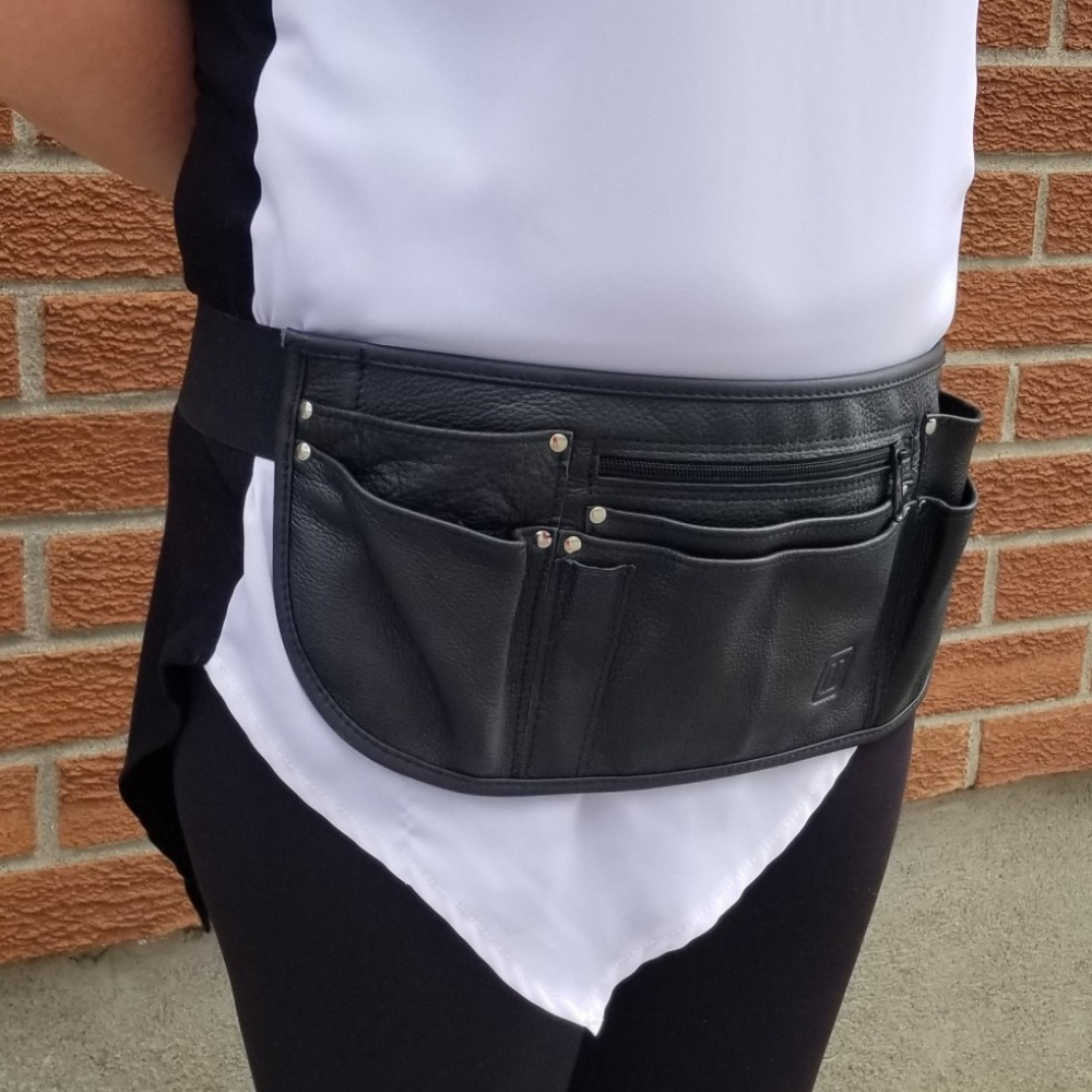 Tablier de serveur/se en cuir souple avec ceinture élastique ajustable, 7 pochettes à rivets dont 2 avec fermeture éclair et porte-crayon.