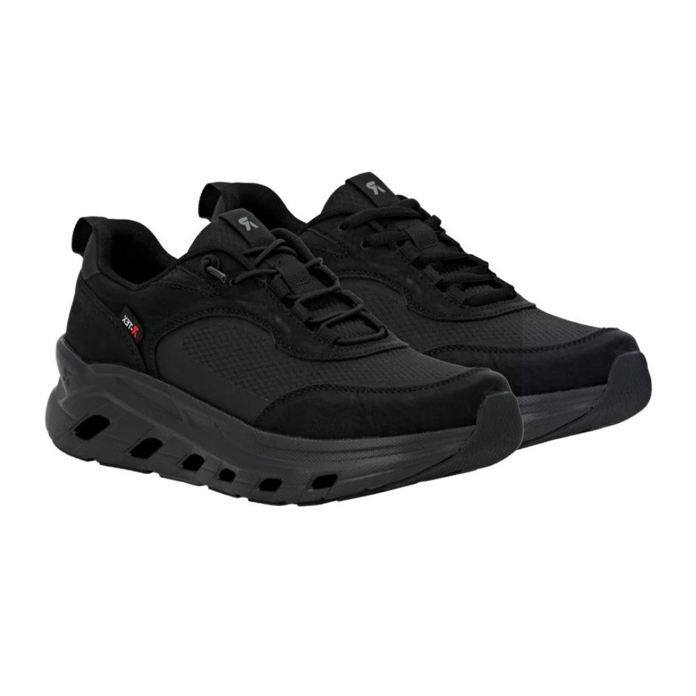 Chaussures Rieker noires en cuir synthétique de qualité. Protection optimale : membrane RiekerTEX déperlante et respirante. Pieds au sec : revêtement HighTech Nano déperlant et anti-salissures. Semelle intérieure MemoCup amovible et rembourrée avec effet rebond pour un déroulé dynamique du talon aux orteils. Doublure Drysport légère et respirante.