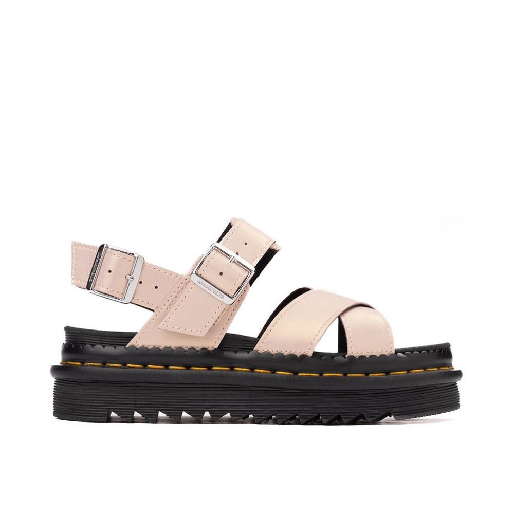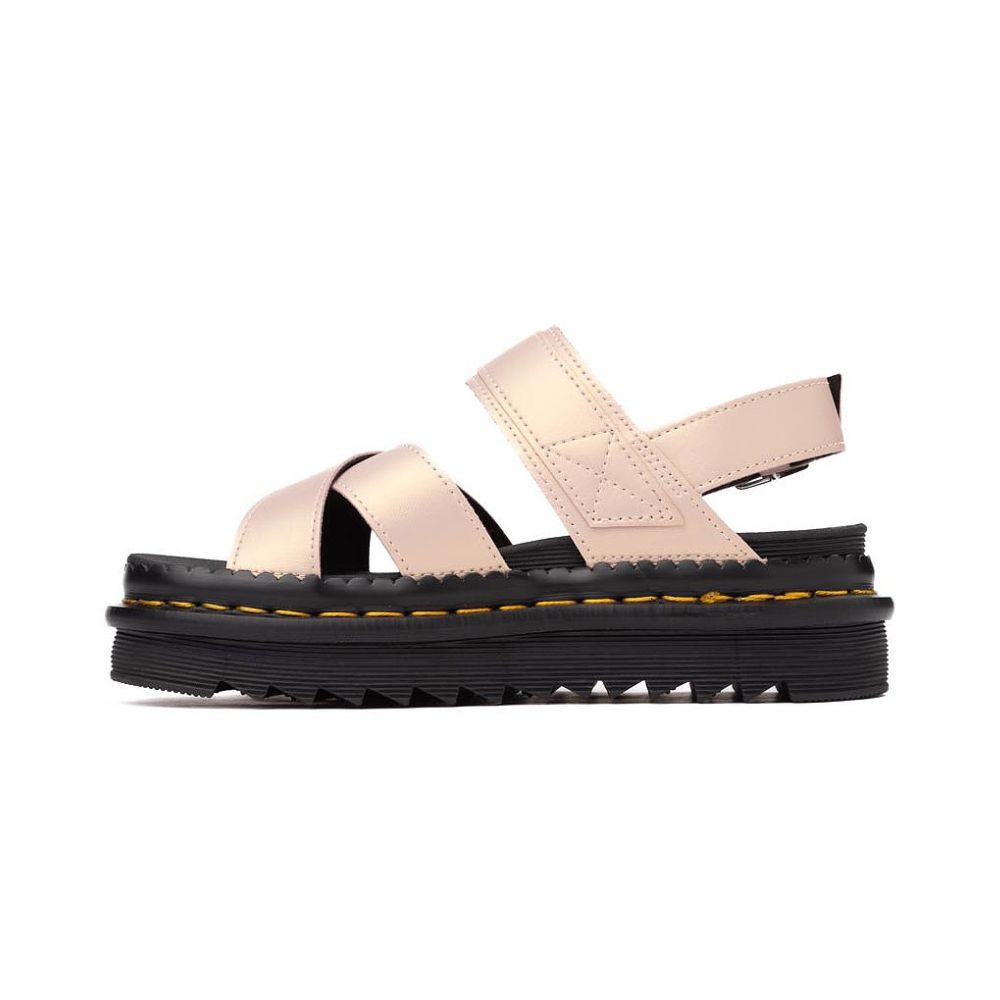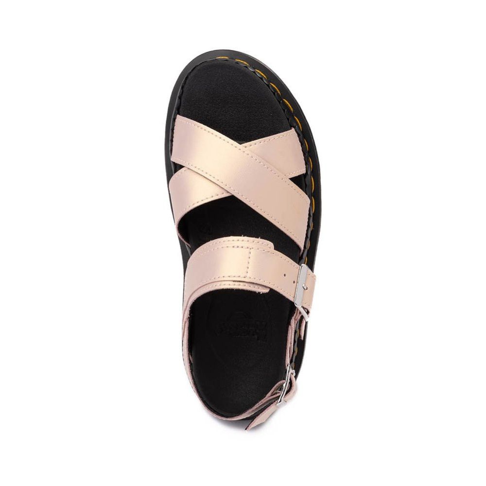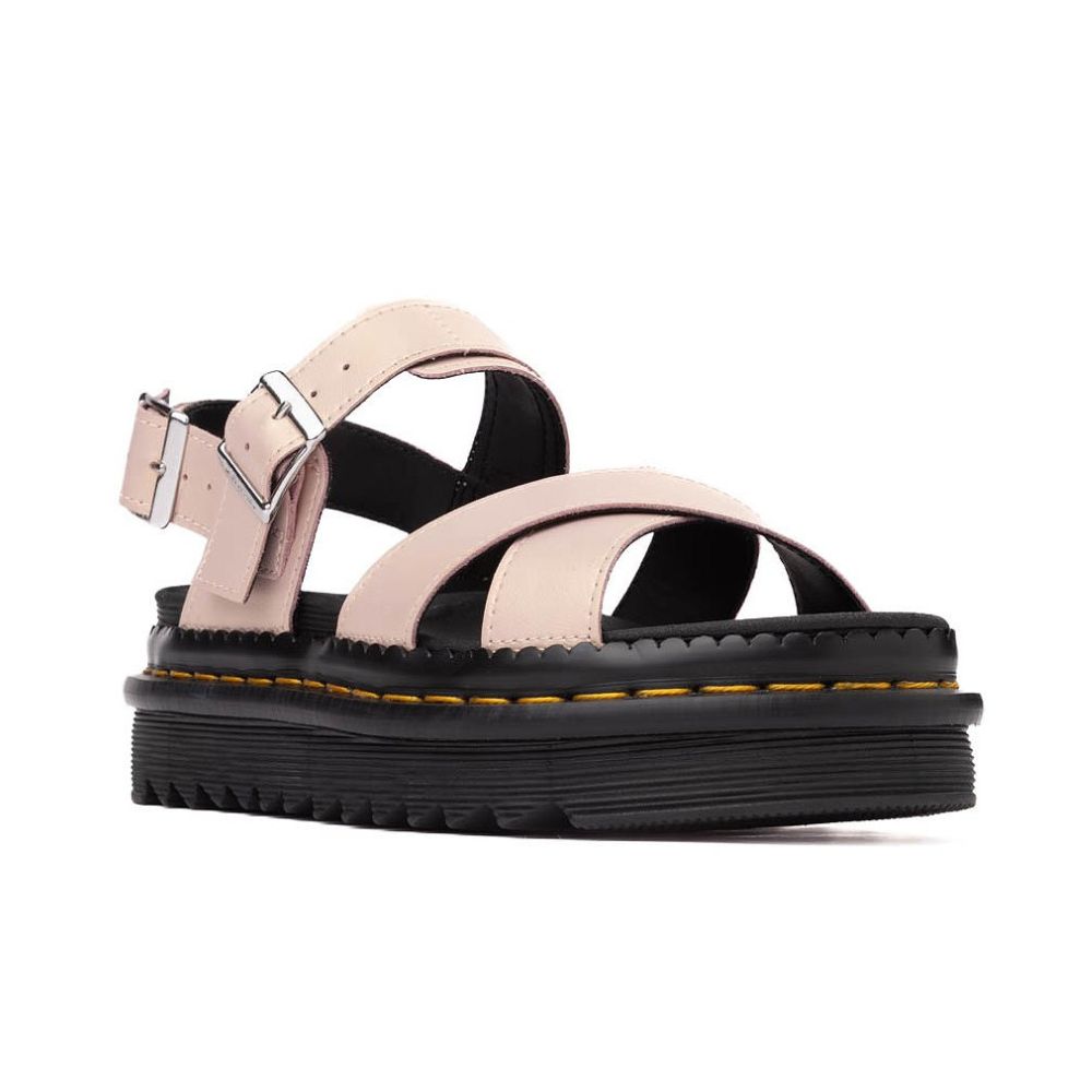 Donne à tes pieds le traitement VIP qu’ils méritent avec la nouvelle sandale Voss II de Dr. Martens! Une version revisitée du modèle classique moderne, cette sandale à sangles croisées est dotée de sangles en cuir Shift iridescent avec des boucles réglables pour un ajustement personnalisé, d'un montage Goodyear®, et d'une semelle extérieure emblématique en PVC à coussin d’air, alliant durabilité et adhérence.