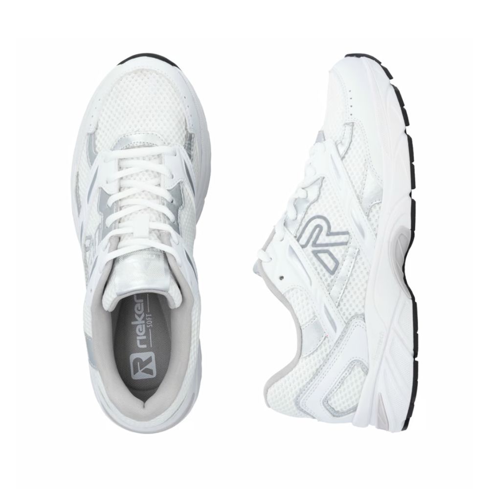 Baskets basses Rieker pour femme, coloris blanc-gris, confectionnées en textile de haute qualité. Semelle extérieure en EVA ultra-légère et flexible. Semelle intérieure amovible et rembourrée favorisant une foulée dynamique. Largeur confortable pour un maintien optimal. Doublure Drysport légère et respirante en microvelours.