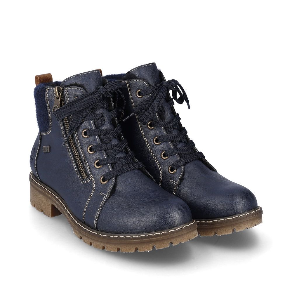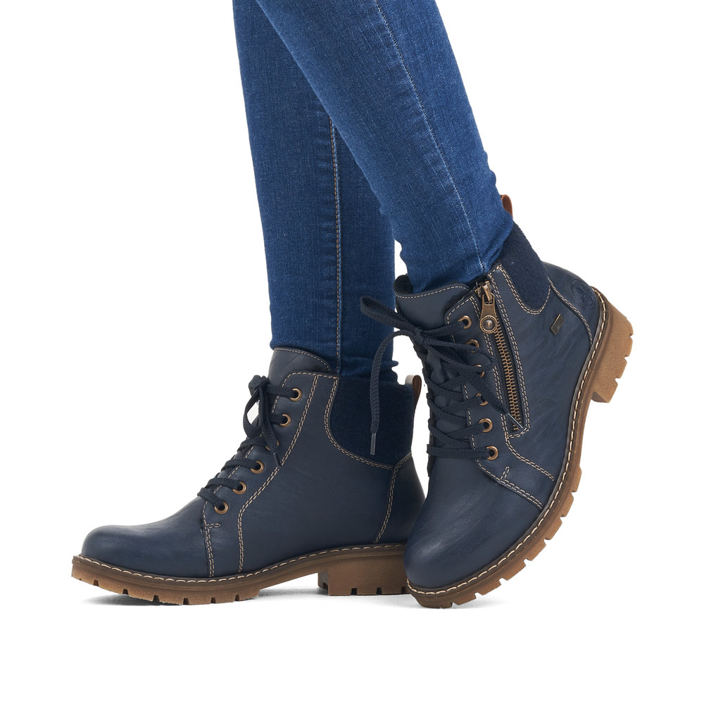Découvrez votre nouvelle chaussure préférée ! Ces bottines à lacets bleu foncé Rieker allient style et fonctionnalité pour les temps frais. Fabriquées selon la technique traditionnelle du cousu, elles allient robustesse et souplesse. Le laçage complète la fermeture éclair et garantit un maintien optimal et un ajustement parfait. Leur semelle adhérente offre une bonne adhérence pour une foulée sûre. De plus, leur semelle extra-douce offre un confort optimal. Vos pieds resteront au chaud toute la journée grâce à la doublure douillette et au sec grâce à la technologie RiekerTEX. Une sensation de bien-être tendance, dans le style Rieker !
