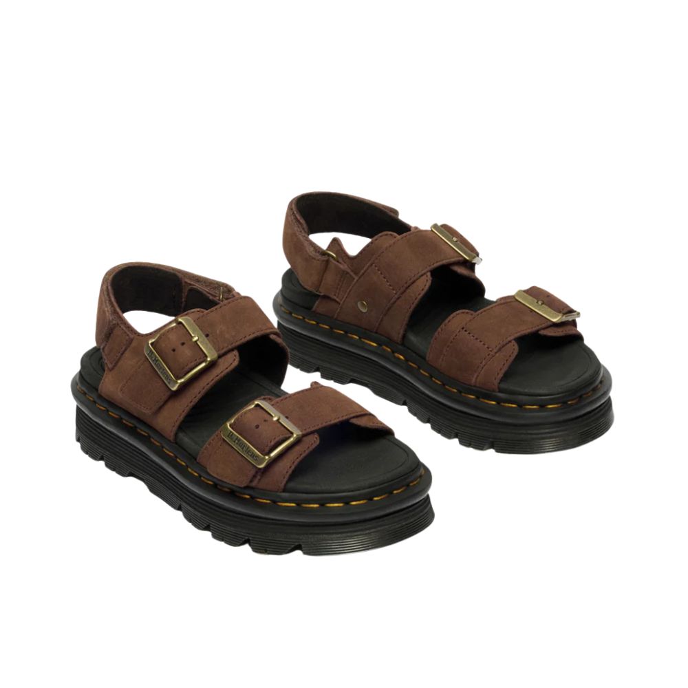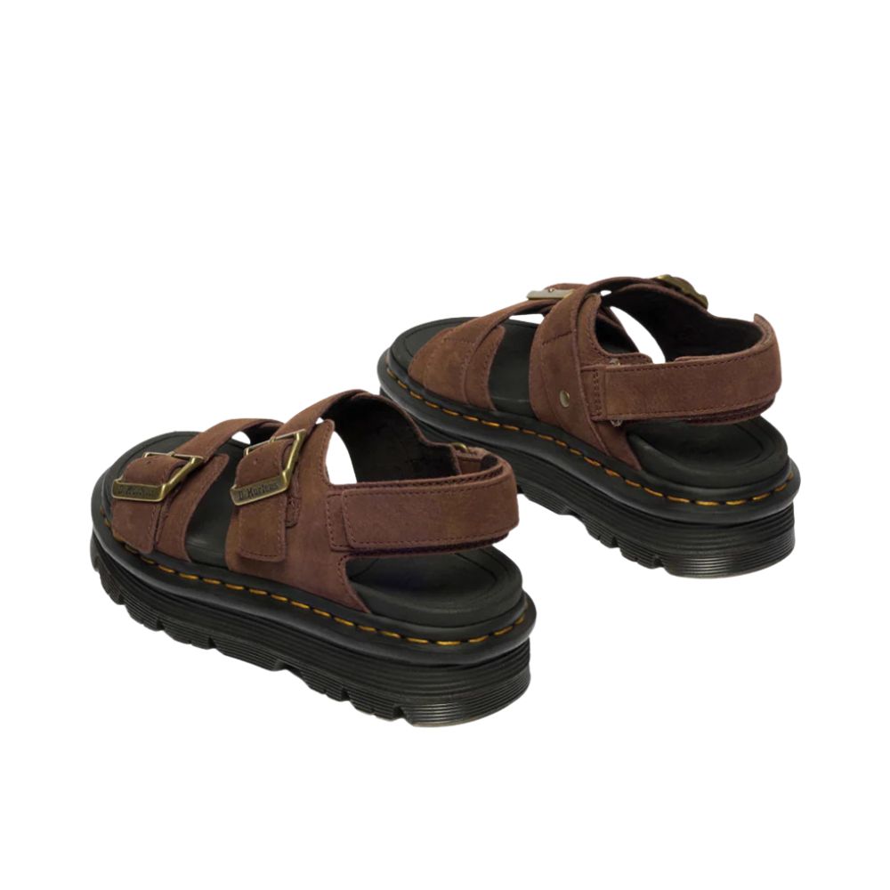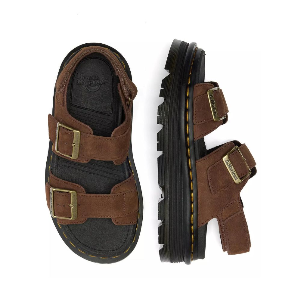 La sandale Zebzag allie simplicité et confort. Confectionnée en nubuck souple brun sépia WP, doux au toucher et traité avec une finition déperlante, elle est prête à affronter toutes les situations. Des boucles en or vieilli et une fermeture auto-agrippante permettent un ajustement parfait, tandis que la semelle hybride à coussin d'air assure un amorti et une stabilité optimaux à chaque pas. Avec sa semelle bicolore noire et fumée et ses surpiqûres jaunes emblématiques de DM, c'est une sandale conçue pour durer.